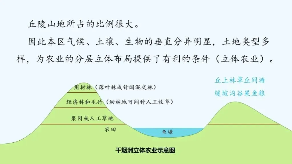 如中国东南丘陵地区、四川西部和青藏高原等地的立体农业均比较突出。这里种植业一般多分布于谷地和谷坡,山地为天然林,间有草地,林线之上为天然草场,具有规律性显著、 层次分明的特点。