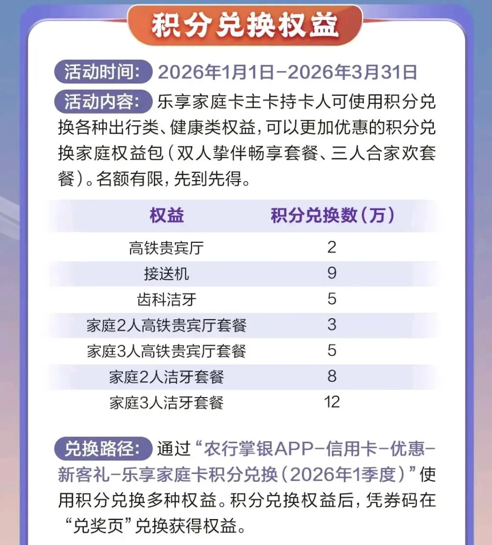 - 每月消费达标领还款券、视频会员,带娃家庭还能领35元亲子乐园立减券,节后带孩子出游再省一笔;- 2026一季度新办卡激活,1分钱抢50元券包,春节用卡直接多享福利!谁该闭眼冲?- 春节全家高铁出行,需要多人贵宾厅的家庭;- 想给家人安排定期洁牙,注重健康管理的朋友;- 家人常用农行信用卡,但积分常年用不上的持卡人。春节回家,既要团圆也要舒适!农行乐享家庭卡用小白金的门槛,搞定全家出行+健康需求,积分共享打破壁垒,日常消费还有多重优惠,堪称家庭持卡人的“必备神卡”~