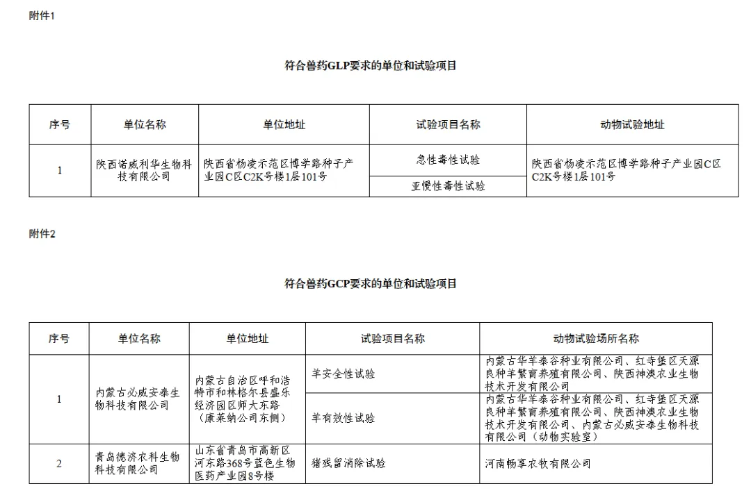 为规范兽药研究活动,根据《兽药管理条例》、《兽药非临床研究质量管理规范》、《兽药临床试验质量管理规范》以及监督检查办法和标准,农业农村部畜牧兽医局组织专家对陕西诺威利华生物科技有限公司、内蒙古必威安泰生物科技有限公司、青岛德济农科生物科技有限公司进行了监督检查。经监督检查,陕西诺威利华生物科技有限公司的2个试验项目符合兽药非临床研究质量管理规范(以下简称“兽药GLP”)要求,检查结果已公示。内蒙古必威安泰生物科技有限公司、青岛德济农科生物科技有限公司等2个单位的3个试验项目符合兽药临床试验质量管理规范(以下简称“兽药GCP”)。现将检查结果予以公布(见附件1、2)。
