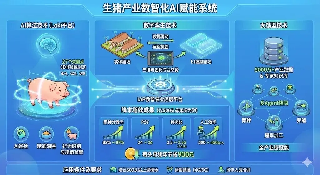 该技术基于“IAP数智农业”底层平台,依托百万级养殖数据训练的AI大模型与智能硬件,构建“感知—决策—执行—反馈”全链闭环系统,通过AI算法实现猪只盘点估重、行为识别与疫病预警,利用数字孪生1:1还原并可视化管控猪场,融合超5000万条产业数据的大模型赋能全产业链。应用于500头以上规模猪场时,可使配种分娩率从82%提升至87%、PSY从24提高至26、料肉比由2.8降低至2.65、人工效率从300头/人增至450头/人,实现每头母猪年节省900元,推动猪场向远程化、精准化、智能化管理升级。