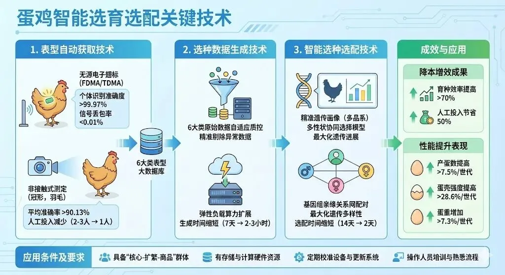 该技术聚焦水质精准检测、智能装备与智能管控,通过自主研发9种在线水质传感器(测量误差较行业标准降低30%以上)、丢包率低于0.1%的可靠传输技术、破损率降低20%以上的多路气动智能投饵装备(投饲效率提升30%以上)、死鱼识别准确率达95%的巡检机器人,并集成310亿参数范蠡大模型,实现全要素感知与精准决策。应用于水体大于900m³的陆基工厂化养殖,可节约饵料10%,提升水体循环利用率至95%,节电20%、节氧30,显著提高养殖密度(石斑鱼40kg/m³、鲈鱼90kg/m³),推动水产养殖向绿色高效智能转型。该技术通过创制信号丢包率仅0.01%、个体识别准确度达99.97%的无源电子翅标,以及准确率90.13%的非接触式表型测定,实现表型自动采集与数据汇聚;应用海量数据弹性编译方法,将选种数据生成时间从7天缩短至2-3小时;并利用遗传亲缘关系网与加权二分图组配方法,将选种选配时间由14天缩短至2天。技术应用使得育种效率提高70%以上、人工投入节省50%,每个世代产蛋数、蛋壳强度和蛋重分别提升7.5%、28.6%和7.3%以上,推动蛋鸡育种向全自动、高效化与智能化转型。6. 主粮种植农事数字管控技术
