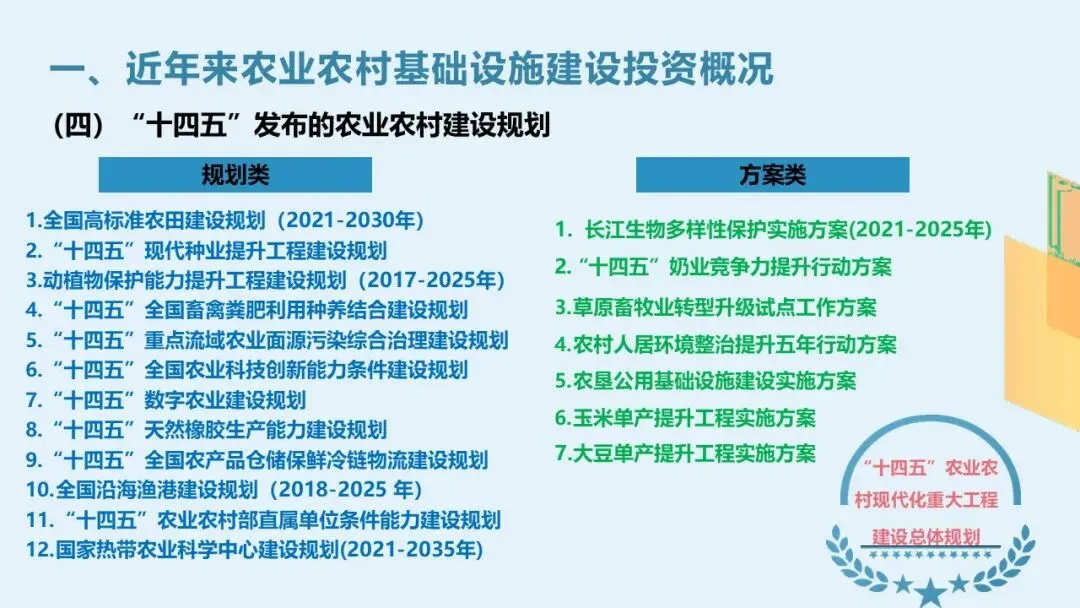 “十五五”期间,农业农村基础设施建设将以“粮食安全、科技自立、绿色转型、乡村补短”为核心,统筹中央预算内投资、超长期特别国债、专项债与金融资本,聚焦高标准农田、现代种业、智慧农业、动植物保护、面源治理与村庄补短板等重大工程,推动形成“大专项+整县推进+数字化赋能”的新格局,加快构建现代农业强国底座。一、“十四五”农业农村基础设施建设回顾