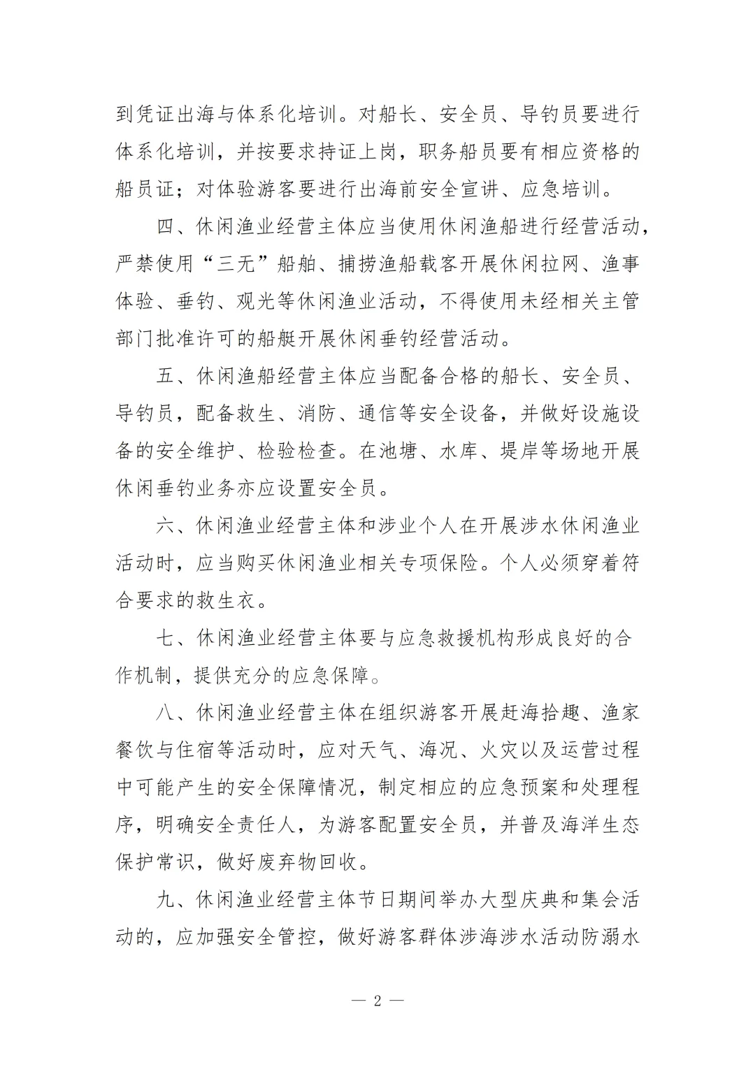 九、休闲渔业经营主体节日期间举办大型庆典和集会活动的,应加强安全管控,做好游客群体涉海涉水活动防溺水等安全风险提示。