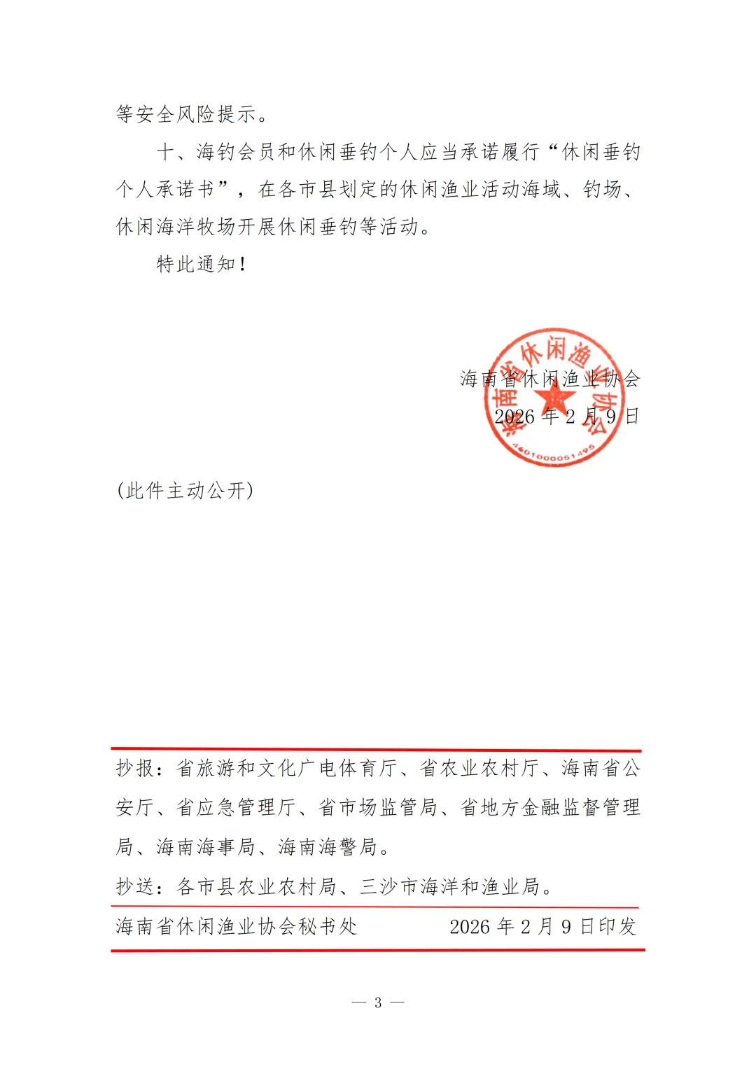 二、休闲渔业经营主体应当遵守《海南省海洋休闲渔船安全管理办法(试行)》和《海南省休闲渔业行业自律行为规范与准则》,履行“海南省休闲渔业经营单位行业自律公约”。出海开展休闲渔业活动应满足符合的天气、海况要求,并应按要求进行人员信息统一报备,对在船人员、船况实现全程“可视、可控、可管”。