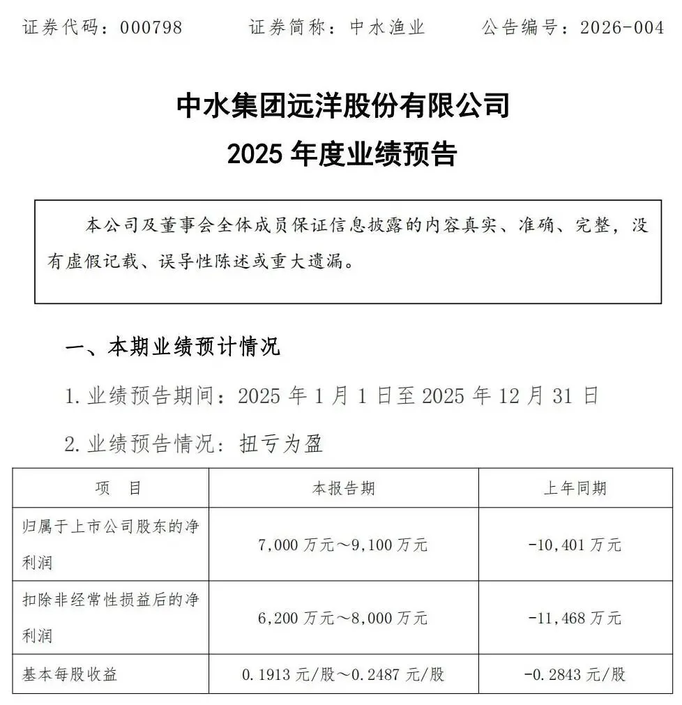 中水渔业发布2025年度业绩预告,预计全年归母净利润7000万元至9100万元,而上年同期净亏损为1.04亿元,扣非净利润预计6200万元至8000万元,同样实现反转。