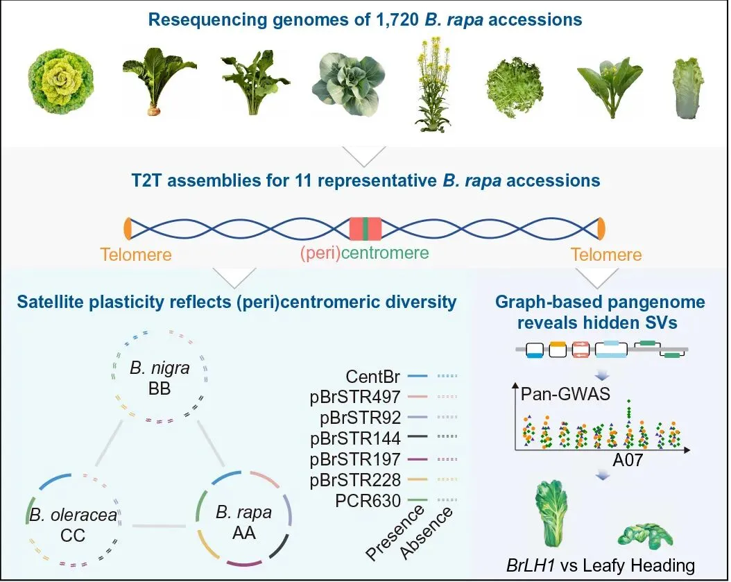主要内容:研究通过重测序1720份白菜材料,从头组装11个覆盖7个亚种的端粒到端粒(T2T)完整基因组和包含31个基因组的高质量泛基因组,系统揭示了卫星DNA、着丝粒动态和基因存在/缺失变异(PAVs)在白菜快速亚种形成中的核心作用,并成功鉴定出控制大白菜结球性状的关键基因BrLH1,将具体亚种的形成与泛遗传变异直接关联起来,为理解被子植物实现快速多样化提供了基因组学支撑。