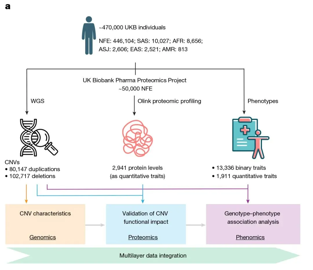 主要内容:该研究通过分析470,727名英国生物银行(UKB)参与者的全基因组序列中的拷贝数变异,并结合2941种血浆蛋白丰度检测结果、13,336种二元临床表型及1911种数量性状,开展了变异级和基因级的表型全关联研究(PheWAS),系统评估了拷贝数变异在各类人类表型和疾病中的作用,为结构变异在药物靶点发现与人群健康研究中的系统应用提供了重要资源。