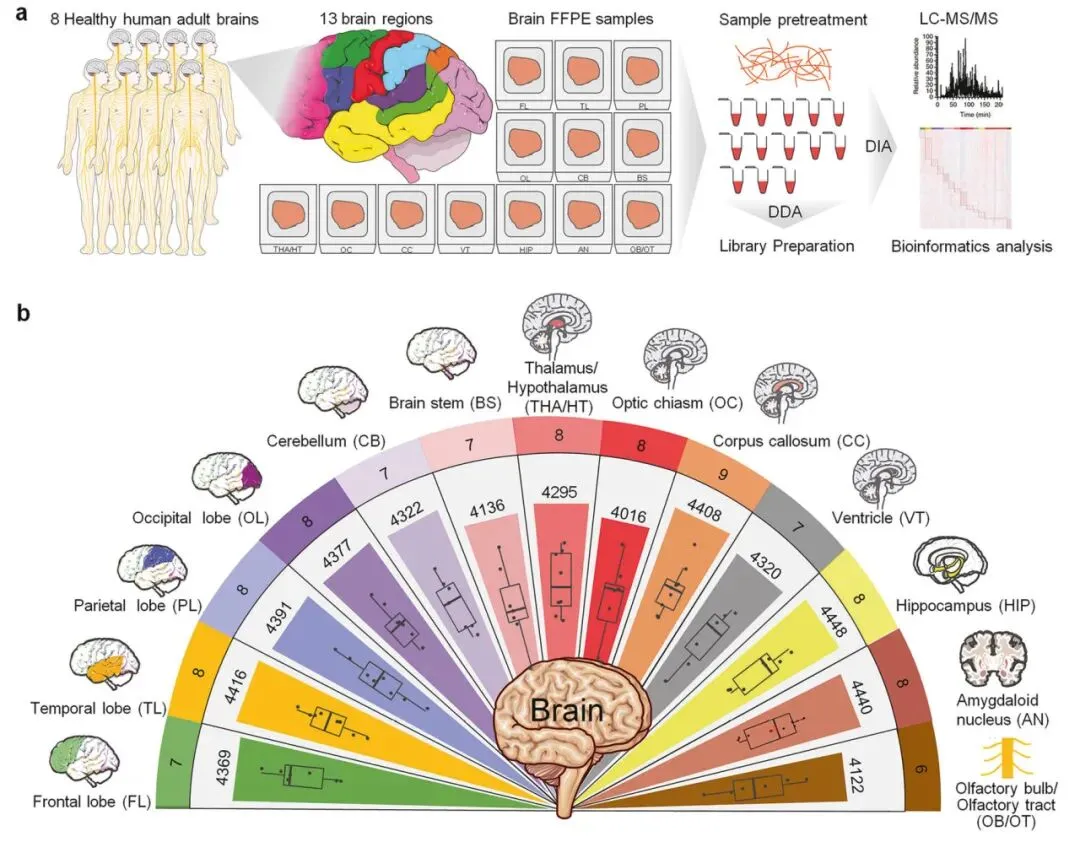 主要内容:该研究对8名捐赠者的13个人类大脑解剖区域进行蛋白质组分析,构建了区域分辨的人类脑蛋白质组图谱,揭示了脑区特异性蛋白质表达模式及其功能关联。该研究揭示了脑区域功能的分子基础,为神经疾病的生物标志物开发提供了靶点,也强调了整合多组学方法研究脑功能与神经疾病的重要性。