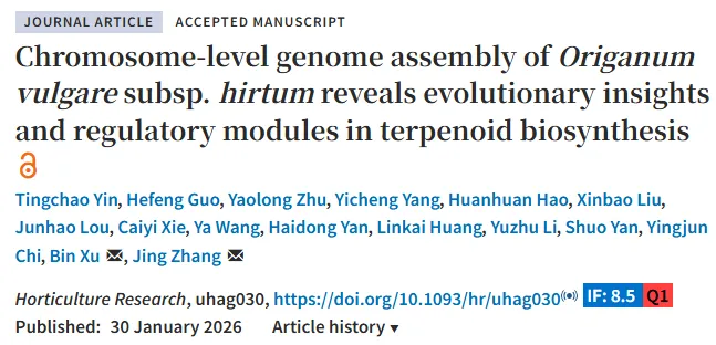 希腊牛至是唇形科高价值芳香草本,其精油(EO)富含百里香酚、香芹酚等萜类生物活性物质,在烹饪、医药、观赏领域应用广泛,且作为抗生素替代品在畜牧业中具有重要价值,其中希腊牛至因精油含量远高于其他亚种成为研究重点。现有牛至基因组为二代测序的碎片化组装,无染色体水平锚定,限制了基因家族进化、萜类合成调控通路的研究;且牛至萜类合成的关键酶基因和转录调控机制尚未明确。近日,南京农业大学草业学院张敬副教授和徐彬教授团队在园艺学顶级期刊《Horticulture Research》上发表了题为:Chromosome-level genome assembly of Origanum vulgare subsp. hirtum reveals evolutionary insights and regulatory modules in terpenoid biosynthesis的研究论文。本研究以希腊牛至(Origanum vulgare subsp. hirtum) 为研究对象,通过多平台测序技术构建了其染色体水平的高质量基因组,结合比较基因组、转录组和功能验证实验,解析了其进化轨迹,并揭示了萜类生物合成的核心调控机制。基因组组装大小达709.74 Mb且锚定至 15 条染色体,scaffold N50 为46.36 Mb,经鉴定该基因组组装准确性、连续性和完整性均较高;通过比较基因组分析发现希腊牛至存在约59.93 Mya的全基因组复制(WGD) 事件,该事件推动了唇形科萜类合成通路的多样化;研究利用大肠杆菌抑菌特性快速筛选出高精油(EO)突变体 HEO,其中 HEO1 的精油含量较野生型(WT)提升 88.24%;结合转录组和功能验证实验,揭示α- 亚麻酸代谢 / 茉莉酸(JA)生物合成通路 正向调控牛至精油合成,且鉴定出JA 诱导的 bHLH 转录因子 OvbHLH13为萜类合成的核心调控因子,其可直接结合并激活OvSDR1启动子,进而促进百里香酚和香芹酚的合成,该研究为希腊牛至的分子育种提供了关键的基因组资源和调控靶点。研究关键结论:本研究鉴定出希腊牛至存在两次 WGD 事件,分别为~58.92 Mya 和~185.31 Mya,其中~58.92 Mya 的 WGD 为希腊牛至与柚木共有的唇形科特有事件,该事件晚于葡萄的 γ 全基因组三倍化事件(~115.91 Mya),是推动唇形科萜类合成进化的核心事件;一方面,WGD 事件导致希腊牛至中萜类合成相关基因家族(CYP450、TPS、SDR、bHLH)发生扩张,为萜类合成通路的多样化提供了遗传基础;另一方面,该 WGD 事件发生在希腊牛至与百里香的分歧之前,是唇形科物种精油含量和成分多样化的重要进化驱动力,同时核型进化导致的萜类合成基因成簇分布,进一步利于基因的协同调控,提升萜类合成效率。1.提供了高质量的染色体水平基因组参考,为牛至萜类合成相关基因的克隆、筛选和分子标记开发奠定了基础;2.鉴定出OvbHLH13、OvSDR1、OvCYP71D178等萜类合成的关键基因,可作为分子育种的核心靶标,通过基因编辑、过表达等手段定向改良牛至精油含量;3.明确了JA 为萜类合成的调控信号,可通过外源 JA 处理或调控 JA 合成通路基因,实现牛至精油的人工调控;4.建立了高 EO 突变体快速筛选方法,并筛选出 HEO1 优良突变体,为牛至的种质资源改良提供了直接的材料基础;5.揭示的调控模块为唇形科其他芳香植物(百里香、迷迭香)的萜类合成遗传改良提供了可借鉴的技术思路。