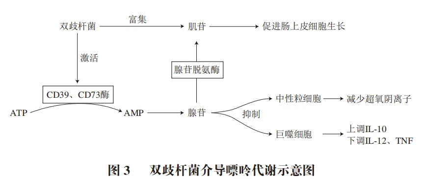 近年来,研究发现双歧杆菌与嘌呤代谢有密切联系(图3)。假长双歧杆菌可通过在肠道积累嘌呤代谢物肌苷增强免疫应答,提高肿瘤免疫检查点阻断疗法的疗效;双歧杆菌还具有激活嘌呤代谢信号通路中CD39和CD73(5’-外核苷酸酶)的潜力,CD39和CD73能够促进胞外ATP的降解,减少炎症介质胞外ATP对免疫细胞的刺激,降低炎症因子的释放。此外,降解ATP生成的单磷酸腺苷(AMP)会进一步分解成腺苷,腺苷能够促进巨噬细胞分泌抗炎因子IL-10,并抑制IL-12和TNF的表达,还能够减少中性粒细胞产生的超氧阴离子。肌苷是腺苷的代谢产物,最新的研究发现,肌苷的富集能够促进肠上皮细胞的生长,此外肌苷的代谢产物次黄嘌呤被发现能够调节肠上皮细胞的能量代谢。Mager等发现肠道低水平的次黄嘌呤以及黄嘌呤氧化酶的高表达是炎症性肠病致病的关键因素,这对改善肠道屏障功能至关重要,或成为缓解和治疗UC的新机制之一。因此,双歧杆菌可能通过调控嘌呤代谢或者富集嘌呤代谢产物缓解肠道的慢性炎症。嘌呤代谢产物及其受体在肠道神经元系统和上皮细胞中广泛分布和表达,并通过免疫等机制参与UC的病理过程。目前双歧杆菌通过调节嘌呤代谢进而缓解UC的报道较少,双歧杆菌-嘌呤代谢产物-免疫途径或许是未来UC辅助治疗的一个新方向。