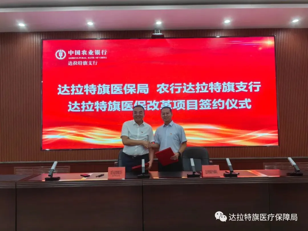 9月12日,旗医疗保障局与中国农业银行达旗支行举行“医银合作”签约仪式。旗医疗保障局党组书记、局长贾军,中国农业银行达旗支行党委书记、行长哈斯额尔德尼代表双方签订了合作协议。
