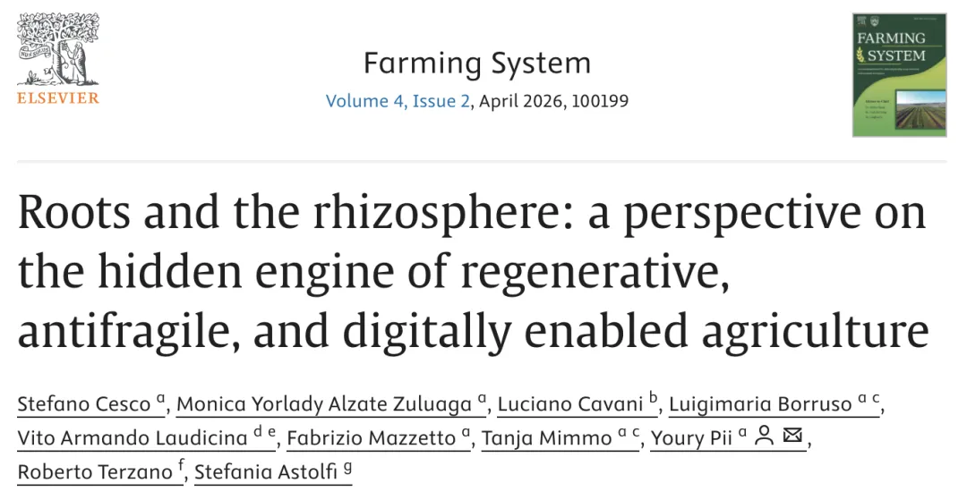 摘要:几十年来,农业生产优化主要集中在地上部分的产量和外部投入上,却忽视了地下过程的复杂性和功能完整性。根际,即根系周围的动态区域,长期以来一直是通过分离的组件进行研究,但很少在整体框架下进行研究,尽管它在农业生态系统生产力、土壤肥力和可持续性方面起着关键作用。此外,将这一知识转化为常规农场规模的实践仍然十分有限。本文观点主张将根际重新定位为农业创新的核心。从这个角度来看,根系及其微生物伙伴不仅对作物生长表现至关重要,也是增强农业系统抗逆性的驱动力,使农业系统能够在环境压力下承受甚至改善,同时维持生产力。结合根系生物学、土壤化学、微生物生态学和农学的进展,本综述表明根际过程驱动着关键的生物地球化学功能,如碳固存、养分循环和适应胁迫。关键的差距包括在作物育种中对根系 - 微生物组特性的整合有限、缺乏适用于田间的根际诊断方法,以及微生物接种剂在不同土壤和气候条件下的性能不稳定。应对这些挑战对于在田间规模实施根际科学以及支持低投入、气候适应性强的农业系统至关重要。展望未来,从高分辨率成像和光谱学到人工智能的新兴技术为深入了解地下复杂性提供了前所未有的视角,也为弥合实验见解与实际农业之间的差距提供了独特的机会。最后,本综述呼吁进行范式转变,将根际过程融入作物育种、农业系统设计和管理策略中。认识到根际是创新的主要切入点,对于将科学转化为促进再生、抗逆和可持续农业的实用手段至关重要。