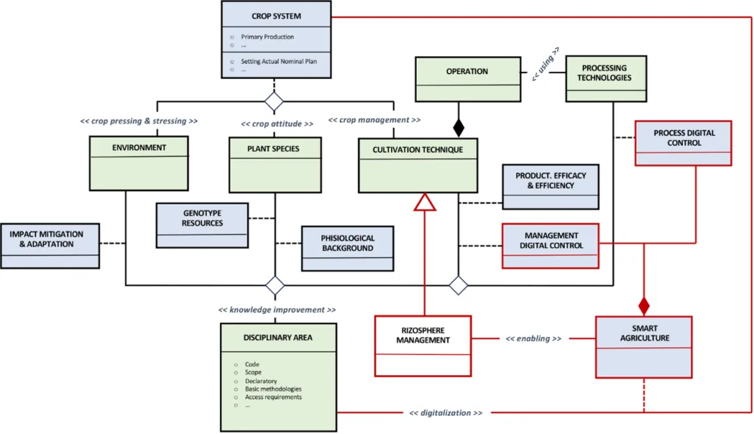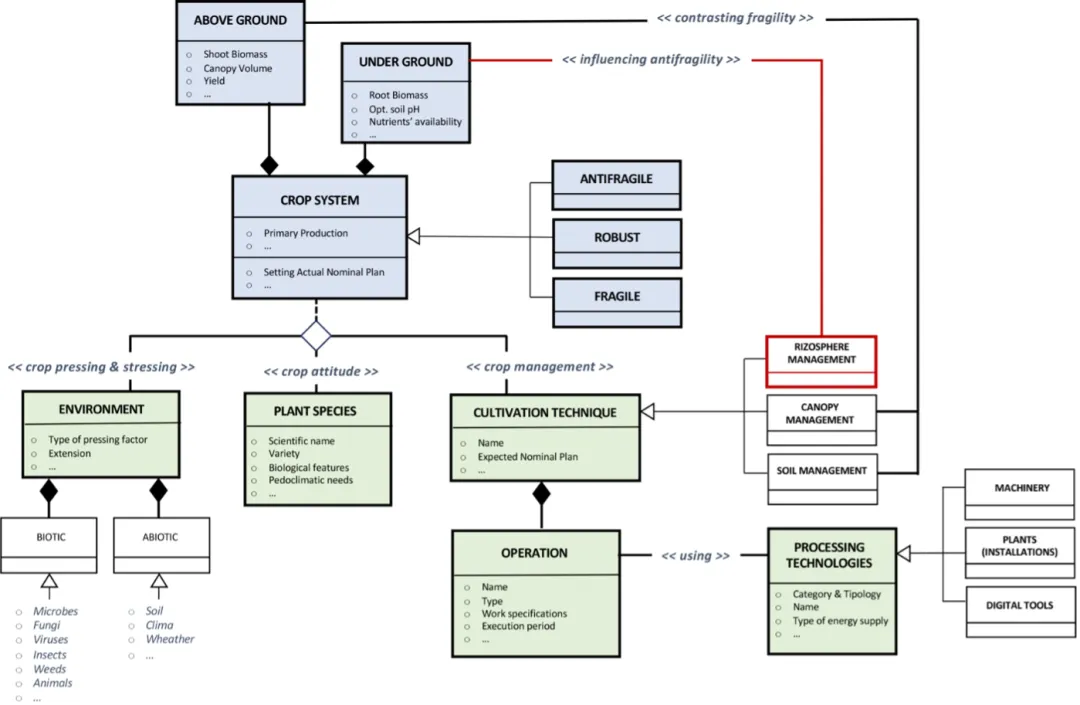 Fig.4.UML-based operational scheme for implementing a rhizosphere-centric paradigm supported by digital technologies for an AI-driven antifragile agriculture.