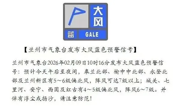 兰州市气象台2026年02月09日10时16分发布大风蓝色预警信号:预计今天午后至夜间,皋兰北部、榆中中北部、永登北部及兰州新区有5~6级偏北风,阵风可达7级以上;城关、七里河、安宁、西固及红古有4~5级偏北风,阵风6~7级。并伴有浮尘或扬沙,请注意防范!