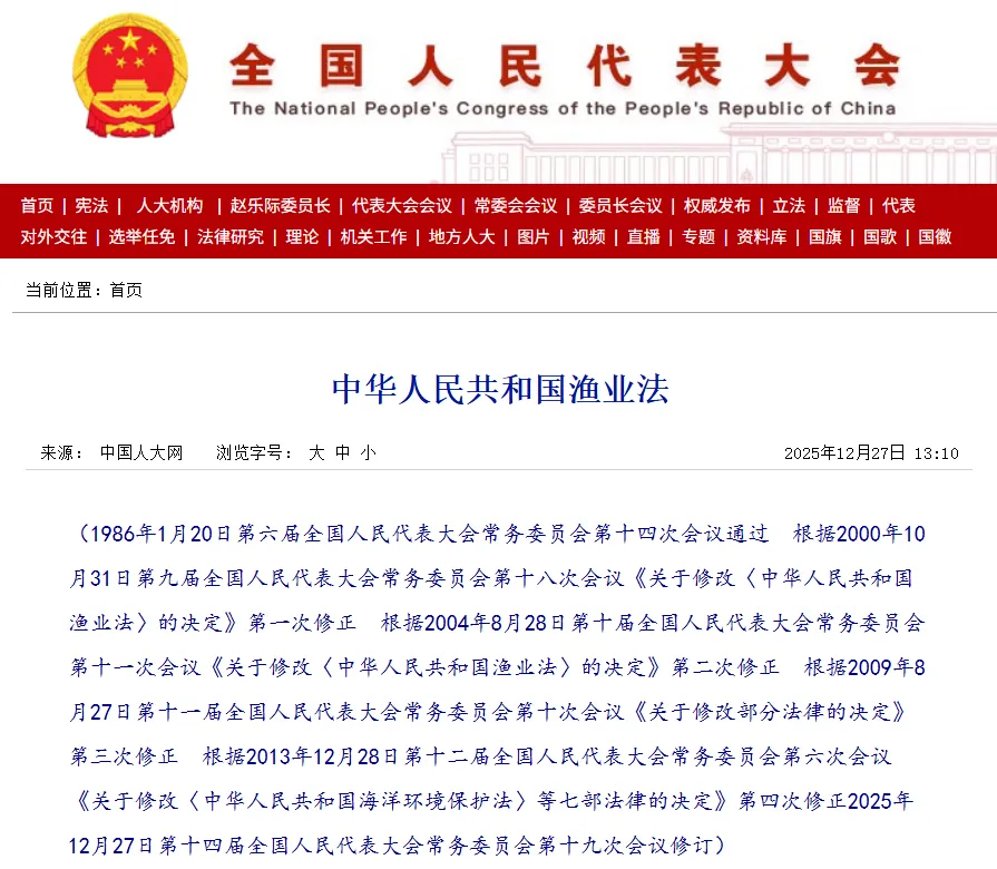 2025年12月27日,《中华人民共和国渔业法》完成近40年来最重要的一次修订,将于2026年5月1日起正式施行。