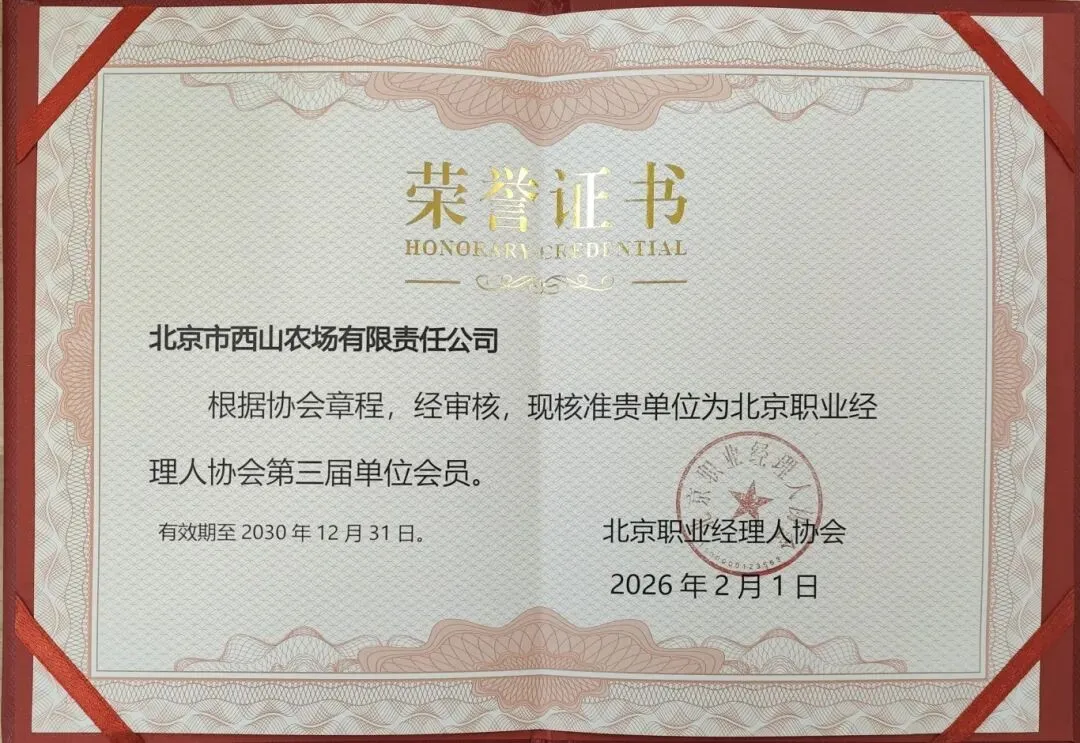 近日,西山农场获评“农业经理人之家”荣誉称号。该荣誉由北京职业经理人协会颁发,是对农业经营主体在农业经理人培养、经营管理能力建设及规范化运行等方面成效的综合认可。