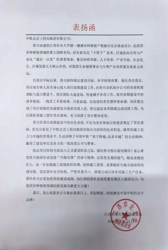 近日,江西农业大学项目收到建设单位江西农业大学校园建设处发来的表扬函。