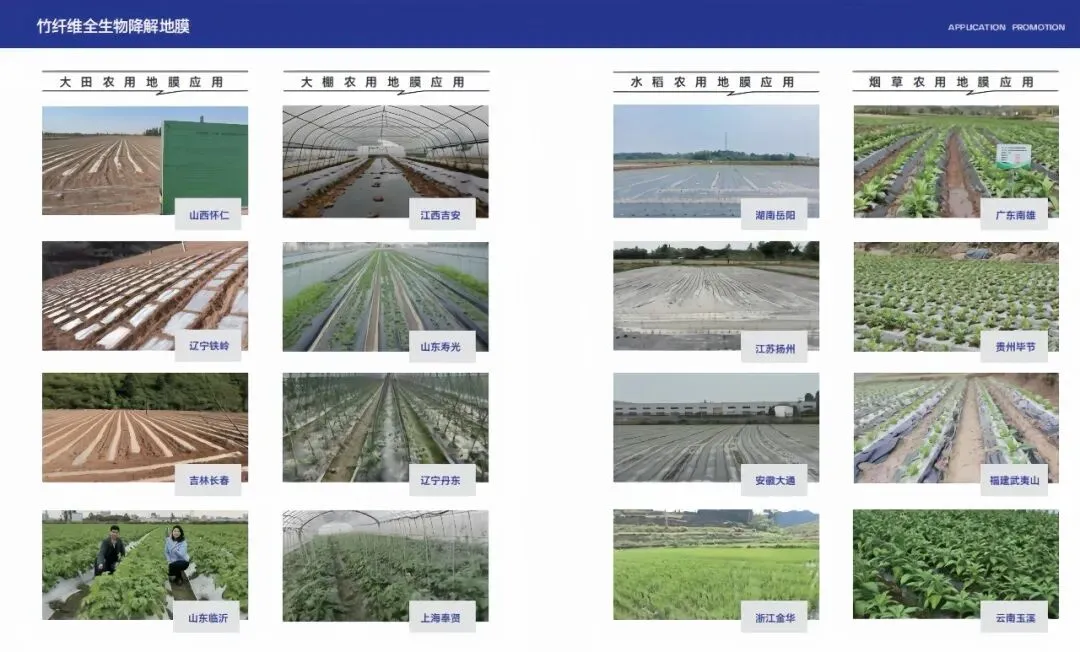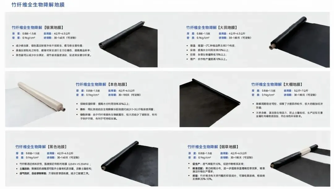 · 竹纤维全生物降解大田地膜:集增温、保墒、控草、增产于一体,助力农作物平均产量提高10%以上;