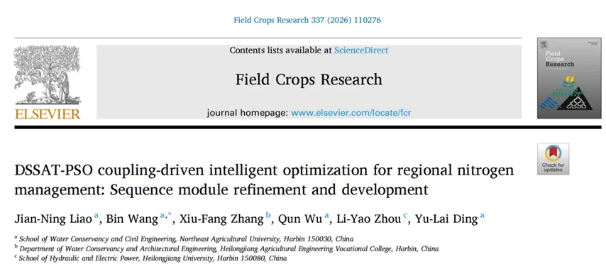 LiaoNJ,WangB,ZhangFX,etal.DSSAT-PSOcoupling-drivenintelligentoptimizationforregionalnitrogenmanagement:Sequencemodulerefinementanddevelopment[J].FieldCropsResearch,2026,337110276-110276.