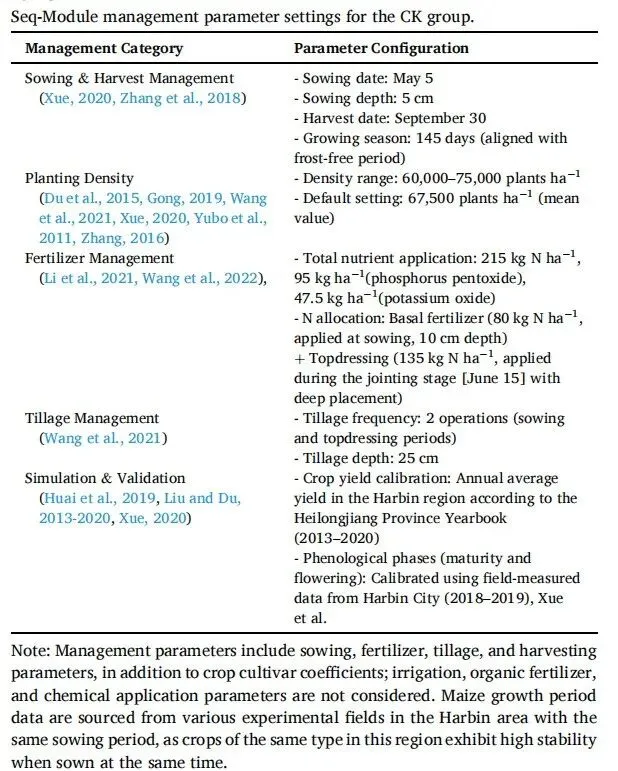 本研究以选取黑龙江省哈尔滨市作为单点代表,利用序列模块进行为期8年的玉米连作连续模拟(https://www.harbin.gov.cn/)。气象数据来源于中国气象数据服务中心(https://data.cma.cn),取自“中国地面气候资料日值数据集(V3.0)”。土壤数据来源于世界土壤数据库(HWSD)(Nachtergaele等,2010),用于表征土壤性质。哈尔滨地区耕地范围通过中国科学院空天信息创新研究院开发的30米全球精细土地覆盖产品确定(https://www.cas.cn/)。田间管理参数通过综合黑龙江省春玉米生产系统的农艺实践和同行评审文献确定,以确保模型的准确性和区域适用性。系统整理了播种日期、施肥制度和耕作措施等关键操作参数(表1),以反映当地农业生产实际。