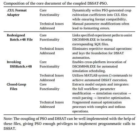 本研究提出了一种集成化的DSSAT-PSO优化框架,用于精准农业决策。通过在MATLAB环境中将粒子群优化(PSO)与DSSAT模型相结合,该方法解决了DSSAT应用模块中内置工具(GENCALC/GLUE)在作物品种参数优化方面的局限性,实现了品种参数的高效自动化校准。
