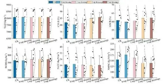 图3 效率提升计划(2013-2020年)下关键氮管理指标的年际变化趋势。这项单点(哈尔滨)研究通过对比常规氮肥施用(对照组:215kgN/ha,单次追肥)与优化追肥策略(215kgN/ha),探究了追肥频率对作物生长的影响。在连续八年(2013-2020年)的研究中,追踪了六个指标:产量、氮利用效率(CUNE)、氮素GNCR(籽粒氮含量比)、土壤有机碳含量(SCDD,0-20cm)、氮累积淋溶量(NLCC)以及氮累积矿化量(NMNC),模拟期定义为从采收到下次采收的时间段