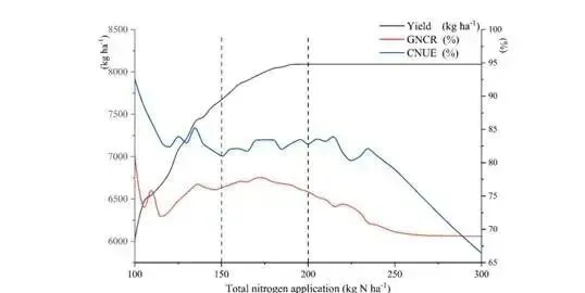 图4 在动态调控总氮施用量条件下,氮肥管理优化的产量、GNCR和 CNUE变化趋势。关键转折点出现在总氮施用量为150和200 kgN/ha时