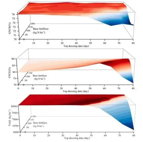 肥用量与后续施肥时间的交互作用对玉米产量和氮素利用特性表现出明显的阈值效应:当基肥用量低于100kg・hm⁻²且后续施肥时间晚于50天时,随着基肥进一步减少和追肥延迟,产量、作物氮素吸收效率(CNUE)和籽粒氮素转化率(GNCR)均同步下降。