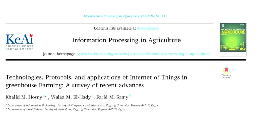 Khalid M. Hosny, Walaa M. El-Hady, Farid M. Samy. Technologies, Protocols, and applications of Internet of Things in greenhouse Farming: A survey of recent advances[J]. Information Processing in Agriculture, 2025, 12:91–111