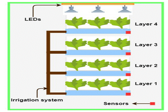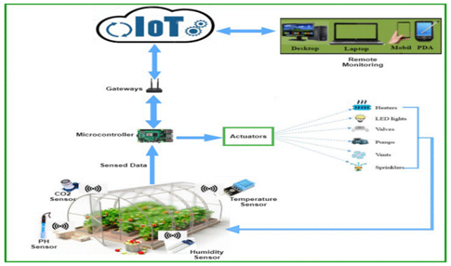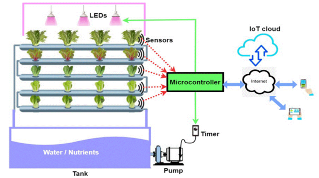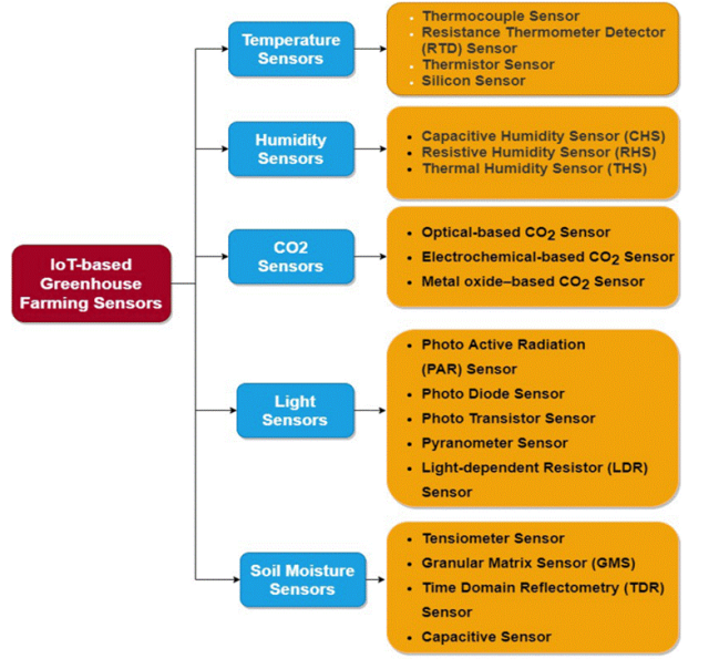 基于物联网的设备广泛应用于医疗保健、智慧城市、农业等许多行业的监测和控制系统。在农业领域,基于物联网的技术包括传感器、执行器、无人机、云计算、导航工具和分析系统,使有效的决策能够以更少的人为干预提高作物产量。这些物理设备和传感器监控并收集温度、光照、湿度、强度和土壤湿度数据。物联网支持温室农场监测和控制系统的自动化,同时为农民提供对存储在云计算服务器上的环境数据的访问,从而支持决策和高效的资源利用,包括水、农药、供暖等。基于物联网的温室农业技术主要有三种,智能温室、水培和垂直农业。