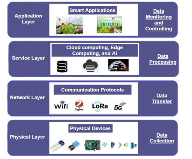基于物联网的温室农业体系结构包括四个基本层次:应用层、服务层、网络层和物理层。物理层包含多个传感器、各种执行器和微控制器,在这一层感测环境参数,然后根据预定指令启动,该层传输的数据和接收的指令流经网络层。网络层包括标准通信协议(LoRaWAN、SIGFOX、Wi-Fi、ZigBee等)和物联网协议(MQTT、HTTP和CoAP)。服务层提供了许多技术,包括云计算、雾/边缘计算和应用层的人工智能。在应用层,使用前几层的服务来执行一些基于物联网的农业活动,如监测、控制、跟踪和预测。