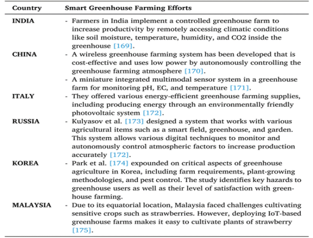 发达国家为农户应对各类挑战提供了诸多新途径,在温室种植领域尤为显著。表1总结了部分国家基于物联网的温室种植实践。