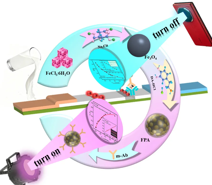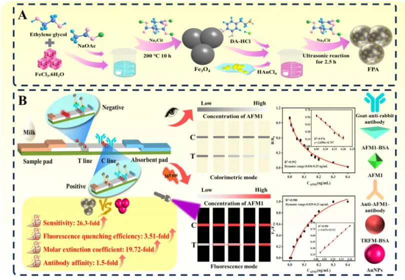 Scheme 1. Schematic diagram of the FPA-LFIA; (A) Synthesis of FPA; (B) Detection principle of FPA-LFIA and comparison of the properties between FPA and AuNPs.