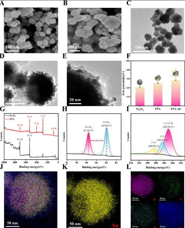 Fig. 1. SEM images of (A) Fe3O4, (B) FPA. (C) TEM image of Fe3O4. (D, E) HRTEM image of FPA. (F) Zeta potential of Fe3O4, FPA and FPA@mAb. (G) XPS curves of Fe3O4 and FPA. (H) Au 4f peaks in FPA composites. (I) C 1s peaks in FPA composites. Elemental mappings of FPA (J), Au in FPA (K) and Fe, N, O, C in FPA (L).