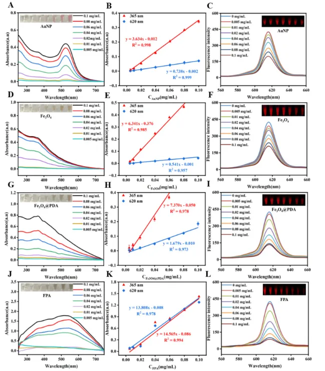 Fig. 2. Calculation of the absorption coefficient and fluorescence quenching constant. UV–vis absorption spectroscopy of (A) AuNPs, (D) Fe3O4, (G) Fe3O4@PDA, and (J) FPA. Absorption coefficient calibration curves of (B) AuNPs, (E) Fe3O4, (H) Fe3O4@PDA, and (K) FPA. Fluorescence spectra of TRFM (100 μL, 0.04 mg/mL), which decreased at 620 nm with the addition of AuNPs (C), Fe3O4 (F), Fe3O4@PDA (I), and FPA (L).