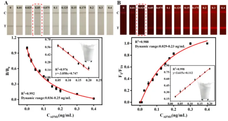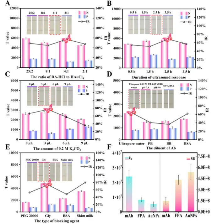 Fig. 3. Optimization of FPA-LFIA material synthesis parameters and labeling conditions: (A) the ratio of DA-HCl to HAuCl4, (B) the duration of ultrasound response, (C) the amount of 0.2 M K2CO3, (D) the diluent of Ab, (E) the type of blocking solution, (F) Comparison of ka and KD.Fig. 4. Photographs and calibration curves of the FPA-LFIA strips. The colorimetric signal (A), and fluorescence signal (B).