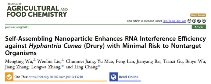 “Self-Assembling Nanoparticle Enhances RNA Interference Efficiency against Hyphantria Cunea (Drury) with Minimal Risk to Nontarget Organisms”文章发表在《Journal of Agricultural and Food Chemistry》。本研究研发出基于噬菌体MS2病毒样颗粒(VLP)并展示HIV-TAT肽的发夹RNA(hpRNA)递送系统,该系统可在大肠杆菌中自组装并高效封装hpRNA,显著提升hpRNA的核酸酶抗性与细胞摄取效率,在低剂量下即可对入侵害虫美国白蛾实现高效的RNA干扰(RNAi)介导的基因沉默,且对分月扇舟蛾、柳蓝叶甲、白蛾周氏啮小蜂三种非靶标生物无显著不利影响,是一种可规模化、高效且环境安全的RNA基害虫防控策略。