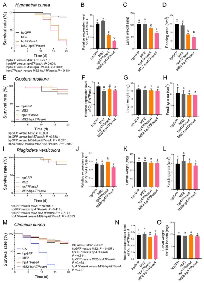 V-ATPaseA/D为美国白蛾高效RNAi靶基因,其沉默可显著降低幼虫存活率;2.MS2-VLPs可成功封装hpRNA,形成直径23-36nm的规则二十面体结构,显著提升hpRNA在昆虫体液中的抗降解能力,且在杨树叶表面的降解速度远慢于裸hpRNA;3.显微注射和饲喂实验表明,MS2-hpATPaseA在低剂量下即可高效沉默靶基因,显著提高美国白蛾死亡率、抑制其生长发育,且效果优于裸hpRNA;4.生物信息学预测显示hpATPaseA对非靶标生物的潜在脱靶位点少,体内实验证实该系统对三种非靶标生物的存活率、体重、靶基因表达均无显著负面影响。