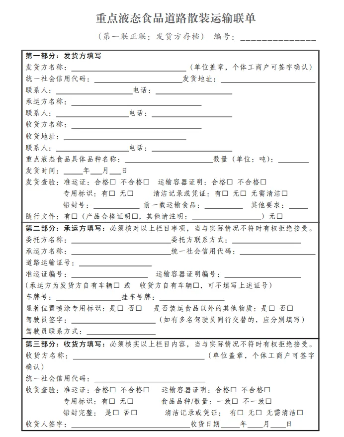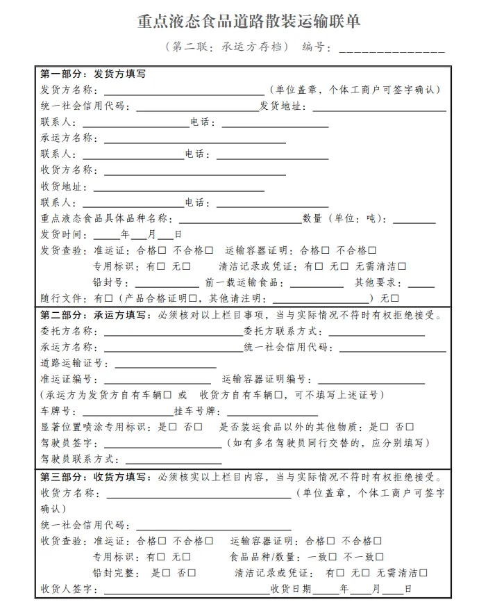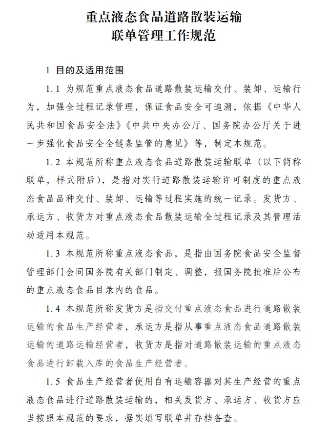 市场监管总局 交通运输部农业农村部 国家粮食和储备局关于印发《重点液态食品道路散装运输联单管理工作规范》的通知
