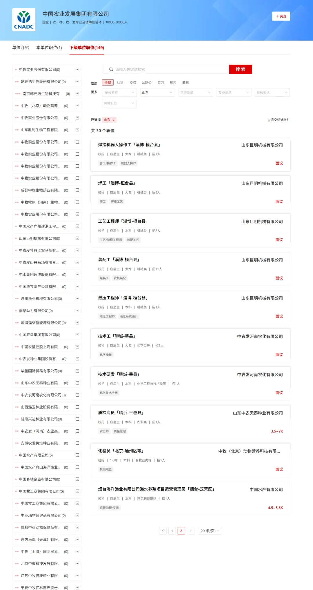 山东农业发展集团有限公司(以下简称山东农发集团)成立于2018年9月,为省属国有企业,隶属山东省农业农村厅和水发集团双重管理。经营范围主要包括物流运输,大宗商品交易服务,农业生态园区建设、运营、管理,房地产开发,矿产资源开发,农业观光旅游,医疗康养服务,新农村田园综合体开发建设,新能源新材料等几大板块。集团下设综合部、财务部、企管部、投资技术部、融资部、乡村振兴产业部、国际部、法务审计部等部室,辖山东农业规划设计院、山东农业产业研究院、山东农村产权交易中心、农发大宗商品交易市场有限公司、山东农发投资发展有限公司、菏泽金农农业发展有限公司、山东农发菌业集团有限公司、江苏瑞泰人造板有限公司、农发兴业源(山东)供应链集团有限公司等20余家子公司。
