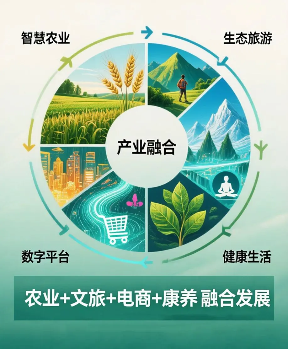 “农业+文旅+电商+康养”的融合,其精髓在于打破产业壁垒,构建一个 “生产、生活、生态”三位一体,且能自我循环、相互赋能的产业生态系统。每一个业态都扮演着不可或缺的战略角色: