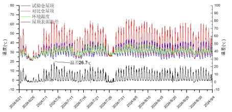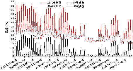 2024年6月21日至9月4日,监测两仓的屋顶温度如下图所示,试验仓相较于对比仓,最大降温温差可达26.7℃。