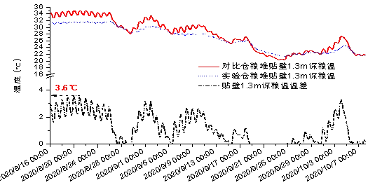 监测结果表明,在粮仓系统应用辐射制冷超材料可极大降低粮库围护结构热,从而改善粮仓内部的热环境,减少夏季粮仓“冷心热皮”现象的发生,实现对仓温和粮温控制或降低,最大限度地保持粮食品质,达到节粮减损的目标。