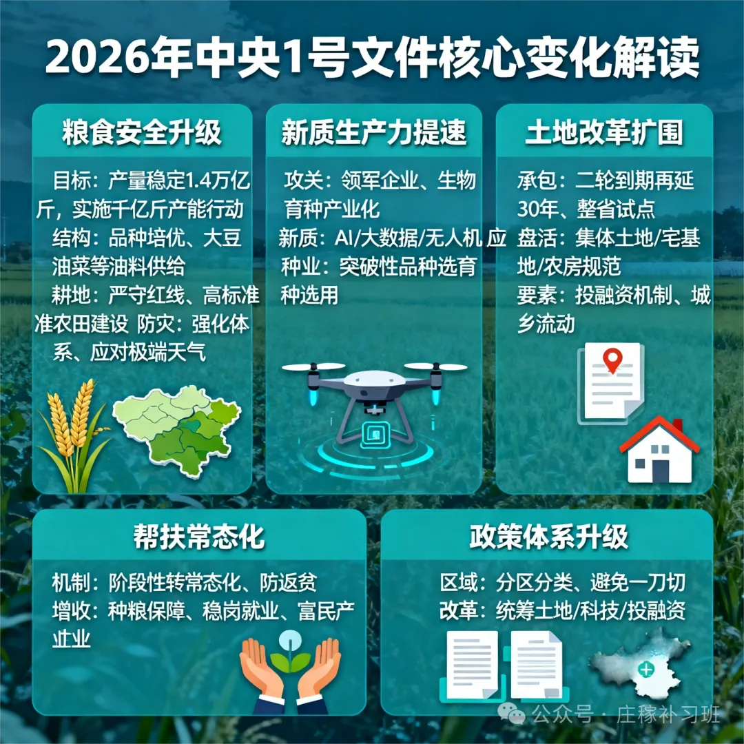 刚发布的 2026 年中央一号文件,作为 “十五五” 首份三农纲领,彻底打破了大家对农业 “只保产量” 的固有认知 —— 从 “保供稳产” 到 “质效并重、系统集成、内生驱动”,这波深刻转型,直接关系到每一位种地人、养殖人、农村创业者的钱袋子!