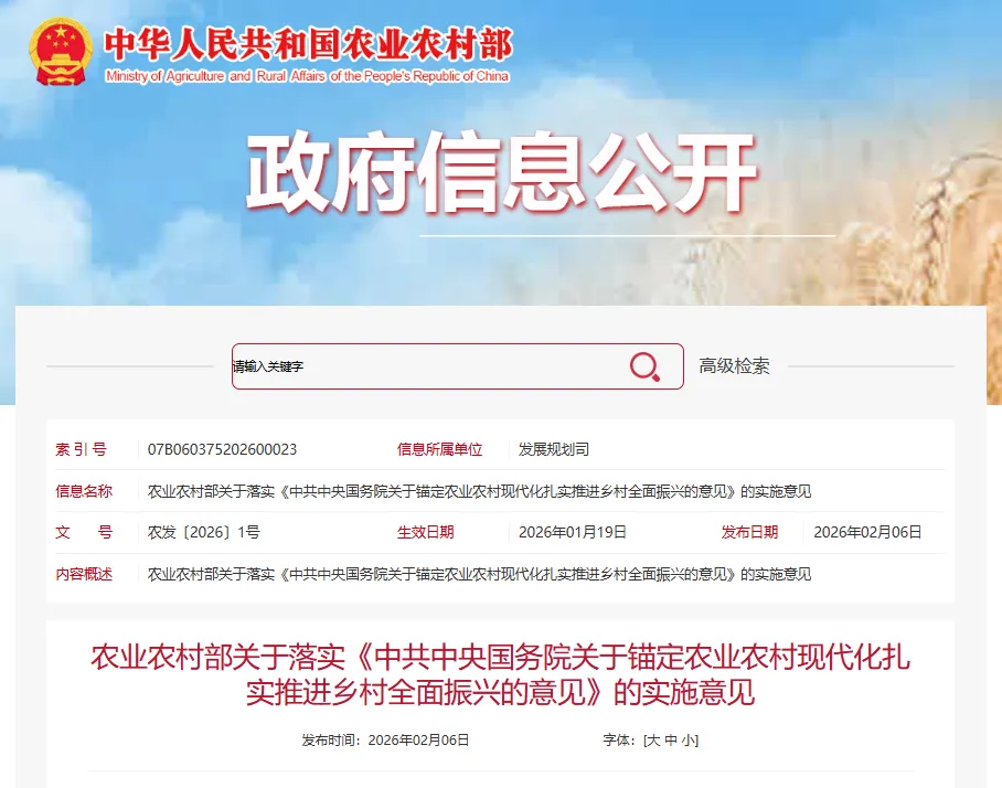 现就落实《中共中央、国务院关于锚定农业农村现代化、扎实推进乡村全面振兴的意见》,扎实做好2026年农业农村工作提出以下具体实施意见。