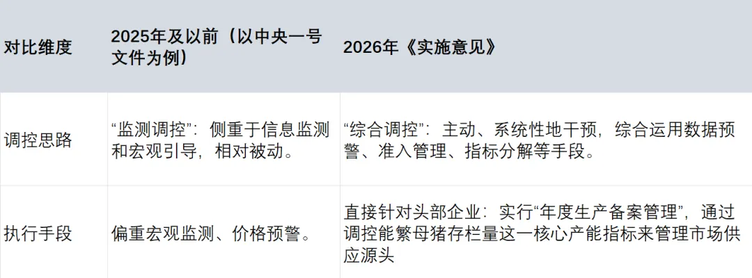 对比往年的生猪行业相关文件以及结合当下养猪业产能调控的背景下,2026年《实施意见》中关于生猪产业的措辞,是当前国家治理产能过剩、推动行业“反内卷”战略在农业领域的关键体现。