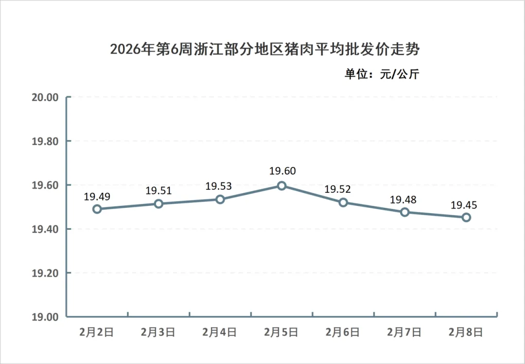 据浙江放心肉商情网对全省80家屠宰厂(场)日报监测统计,2026年第6周(2月2日-2月8日),全省生猪屠宰上市量27.01万头,生猪平均收购价为14.83元/公斤,猪肉平均批发价为19.51元/公斤。