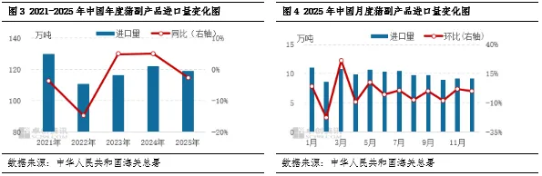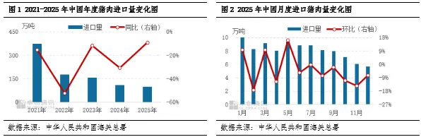 2025年在国内猪肉价格低位下行的大背景下,业内看涨预期下降,叠加重要进口来源国及来源区域进口关税的调整,进口商谨慎拿货,年内猪肉及猪副产品进口量整体下降,总量皆同比减少,其中猪肉进口量创五年来新低。2026年国产猪肉供应依旧充裕,预计猪肉及猪副产品进口总量或继续下降,年内呈先减后增的趋势。
