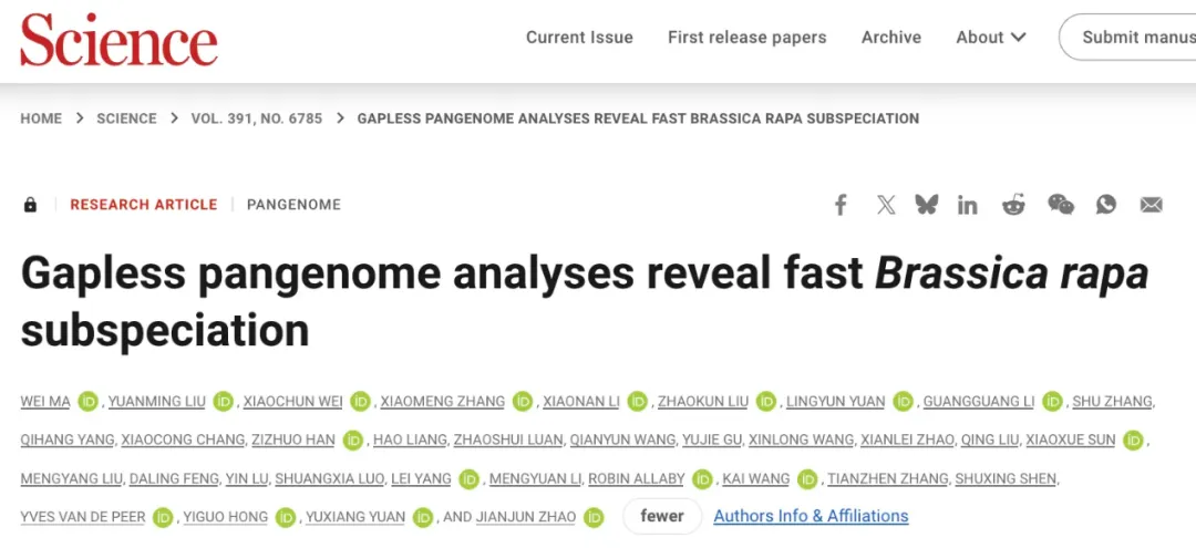 2026年2月6日,国际顶尖学术期刊《Science》正式刊发题为《Gapless pangenome analyses reveal fast Brassica rapa subspeciation》的重要研究成果。该研究由河北农业大学赵建军团队牵头,联合我校国家油菜产业技术体系岗位科学家李晓楠等国内外多家科研单位共同完成。沈阳农业大学首次以共同第一作者单位身份在《Science》正刊发表论文。