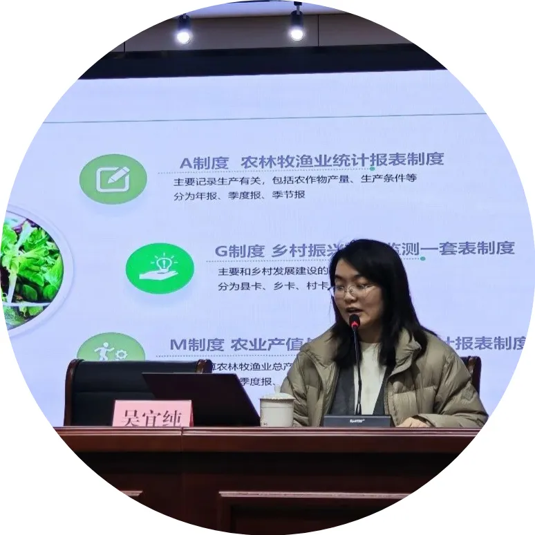 吴宜纯结合农村统计工作中的实际难点、重点问题,从“涉农”核心概念切入,以农业统计涉及的三套制度为核心抓手,逐一解读蔬菜、瓜果、设施农业、经济作物、农业生产条件等各类报表相关指标,明确指标含义和填报标准。同时,对各类统计报表的修订更新内容、具体填报要求进行了说明,着重强调在新增耕地空间有限的现实情况下,农作物生产结构应坚持“总体平稳、有增有减”的基本逻辑,确保统计数据的准确性和一致性。